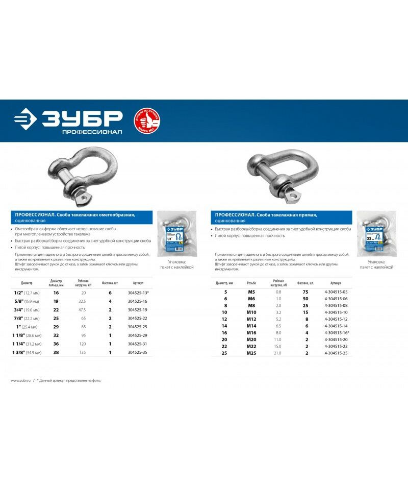 Скоба такелажная омегообразная Зубр 3/4" (19.0 мм) 2 шт, палец 22 мм, г/п 4.75 тн, оцинкованная [304525-19]