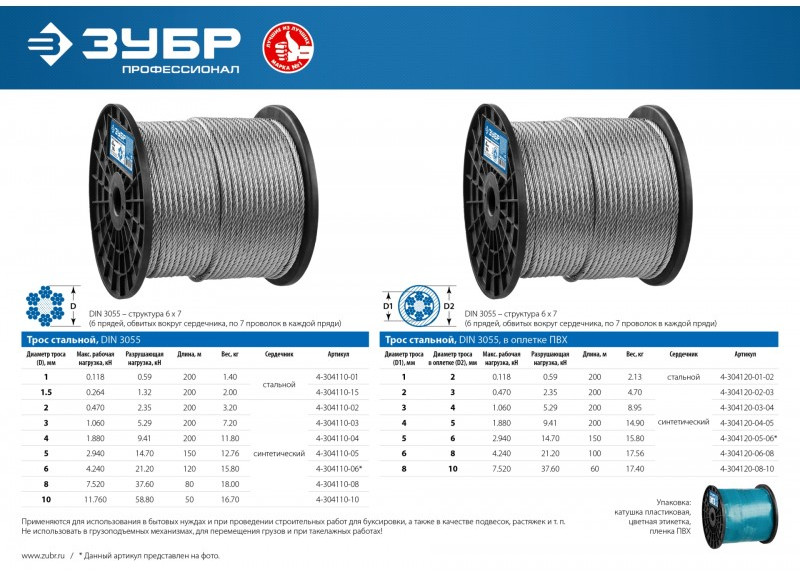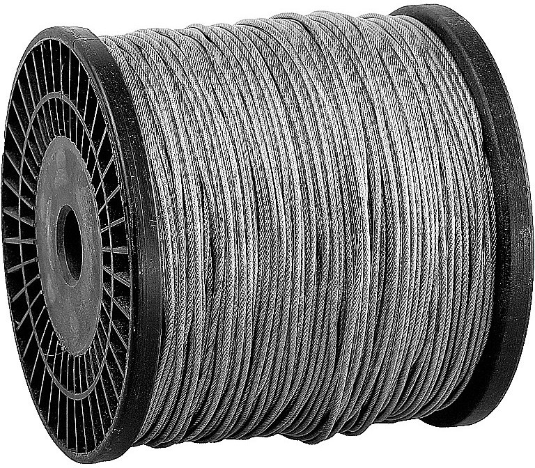 - Тросы общего назначения изготовлены оцинкованной проволоки. Тросы различаются по диаметру и типу поперечного сечения. Соответствуют стандарту DIN 3055, имеют структуру 6х7 (6 прядей, обвитых вокруг сердечника, по 7 проволок в каждой пряди), дополнительно защищены оплеткой из ПВХ.
