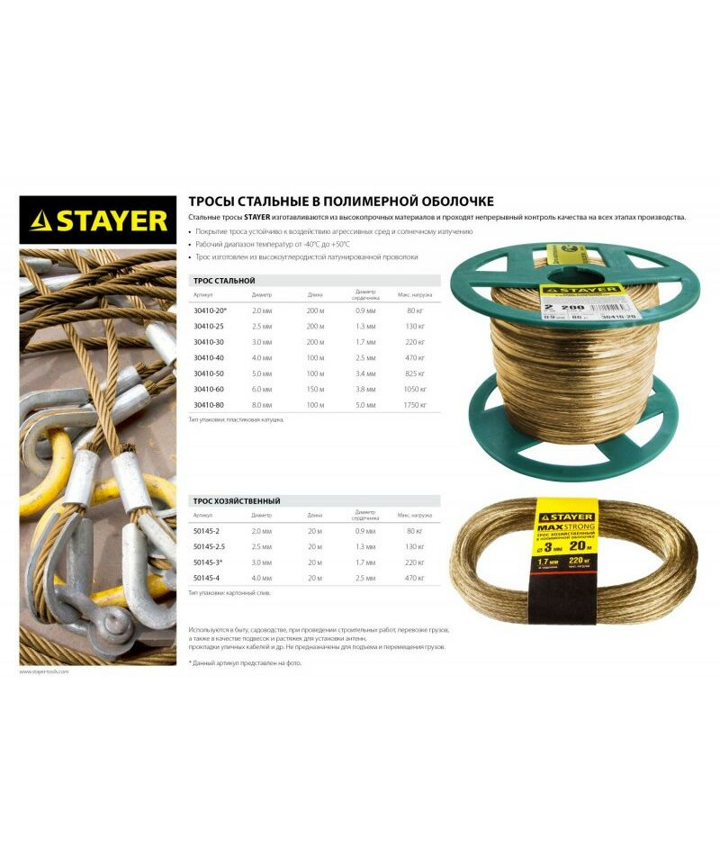Стальные тросы STAYER в полимерной оболочке изготовлены из прочных материалов и применяются во многих сферах жизнедеятельности человека.