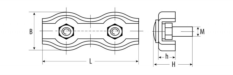 Для формирования петель на концах троса. Используются на тросах без оплетки ПВХ (если трос имеет оплетку, ее необходимо снять перед установкой зажима). Свободный конец троса закладывается в зажим (конец троса должен выходить из зажима на расстояние не менее 1/2 диаметра троса). Далее в петлю троса закладывается коуш, после которого трос помещается в зажим с другой стороны винта. Сверху помещается прижимная пластина, которую небходимо крепко зафиксировать с помощью гаек. Свободный конец троса рекомендуется обмотать изолентой для предотвращения разматывания троса после установки. Перед использованием необходимо убедиться, что гайки на зажимах закручены полностью.