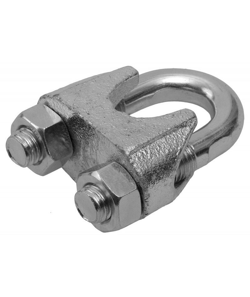 - Использование. Для формирования петель на концах троса. Используются на тросах без оплетки ПВХ (если трос имеет оплетку, ее необходимо снять перед установкой зажима). Свободный конец троса закладывается в зажим (конец троса должен выходить из зажима на расстояние не менее 1/2 диаметра троса). Далее в петлю троса закладывается коуш, после которого трос помещается в зажим с другой стороны отверстия. Сверху помещается прижимная скоба, которую необходимо крепко зафиксировать с помощью гаек. Свободный конец троса рекомендуется обмотать изолентой для предотвращения разматывания троса после установки. Перед использованием необходимо убедиться, что гайки на зажимах закручены полностью. Рекомендуемое расстояние между зажимами равно шестикратному диаметру троса. Минимальное количество зажимов - 3 шт.
