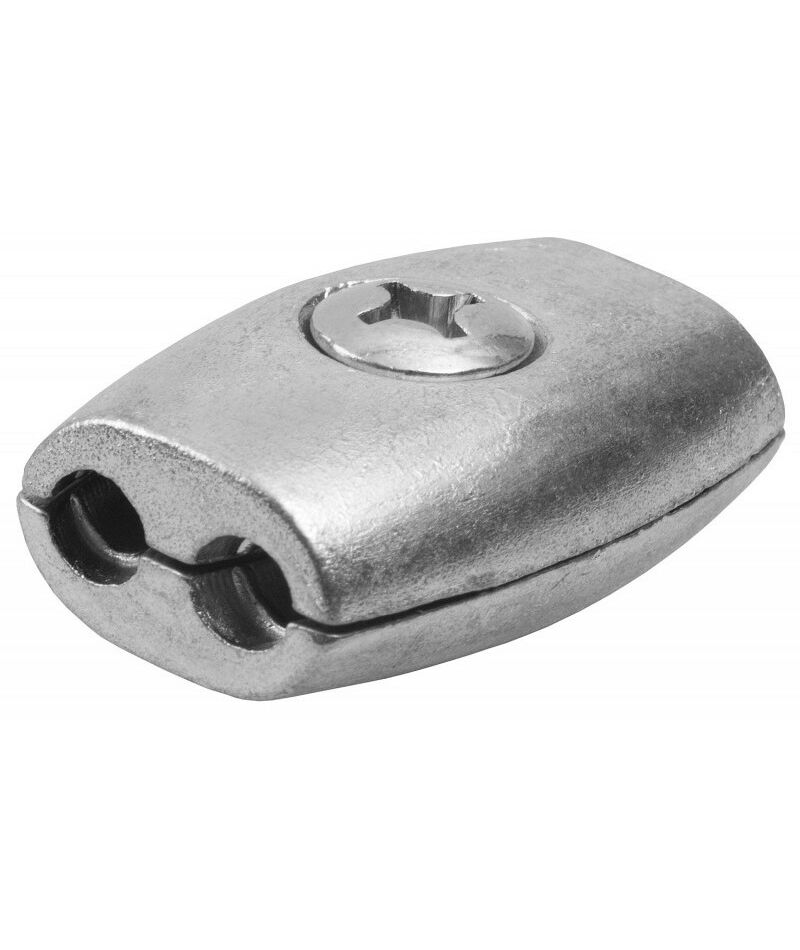 - Использование. Для формирования петель на концах троса. Используются на тросах без оплетки ПВХ (если трос имеет оплетку, ее необходимо снять перед установкой зажима). Свободный конец троса закладывается в зажим (конец троса должен выходить из зажима на расстояние не менее 1/2 диаметра троса). Далее в петлю троса закладывается коуш, после которого трос помещается в зажим с другой стороны отверстия. Сверху помещается прижимная крышка, которую необходимо крепко зафиксировать с помощью винта. Свободный конец троса рекомендуется обмотать изолентой для предотвращения разматывания троса после установки. Перед использованием необходимо убедиться, что винты на зажимах закручены полностью.