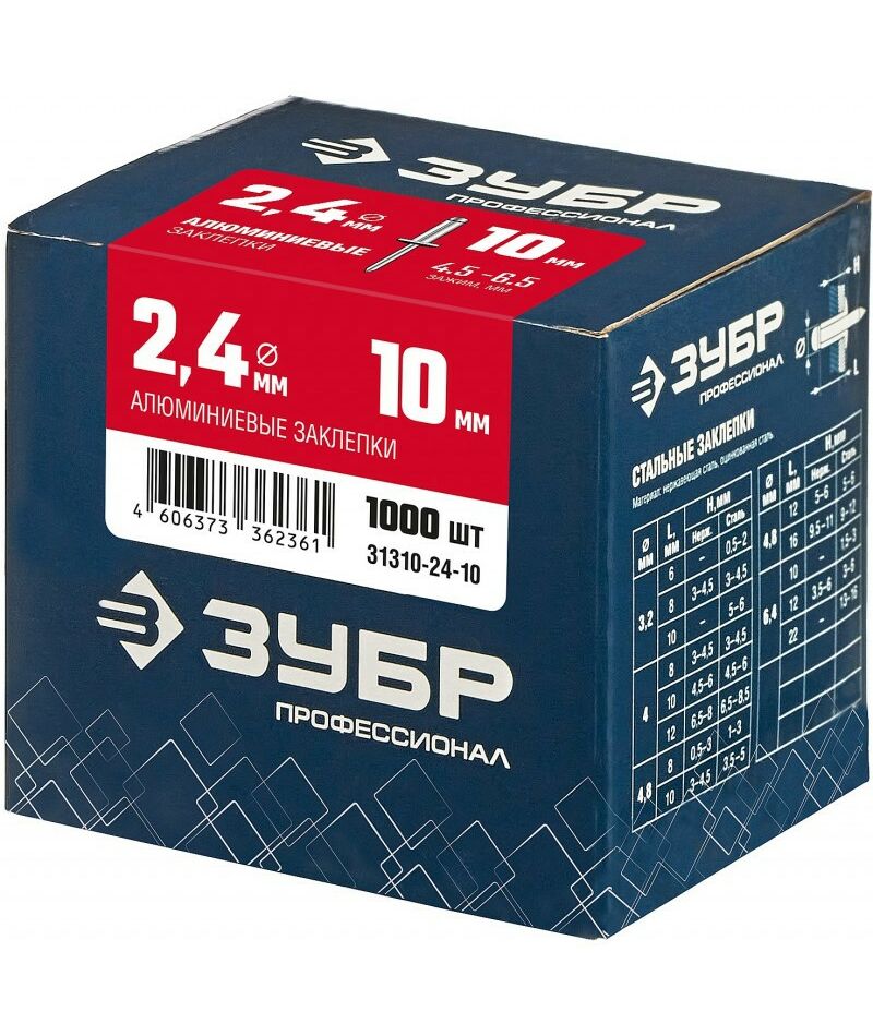 Алюминиевые заклепки Зубр Профессионал 2.4 х 10 мм 1000 шт [31310-24-10]