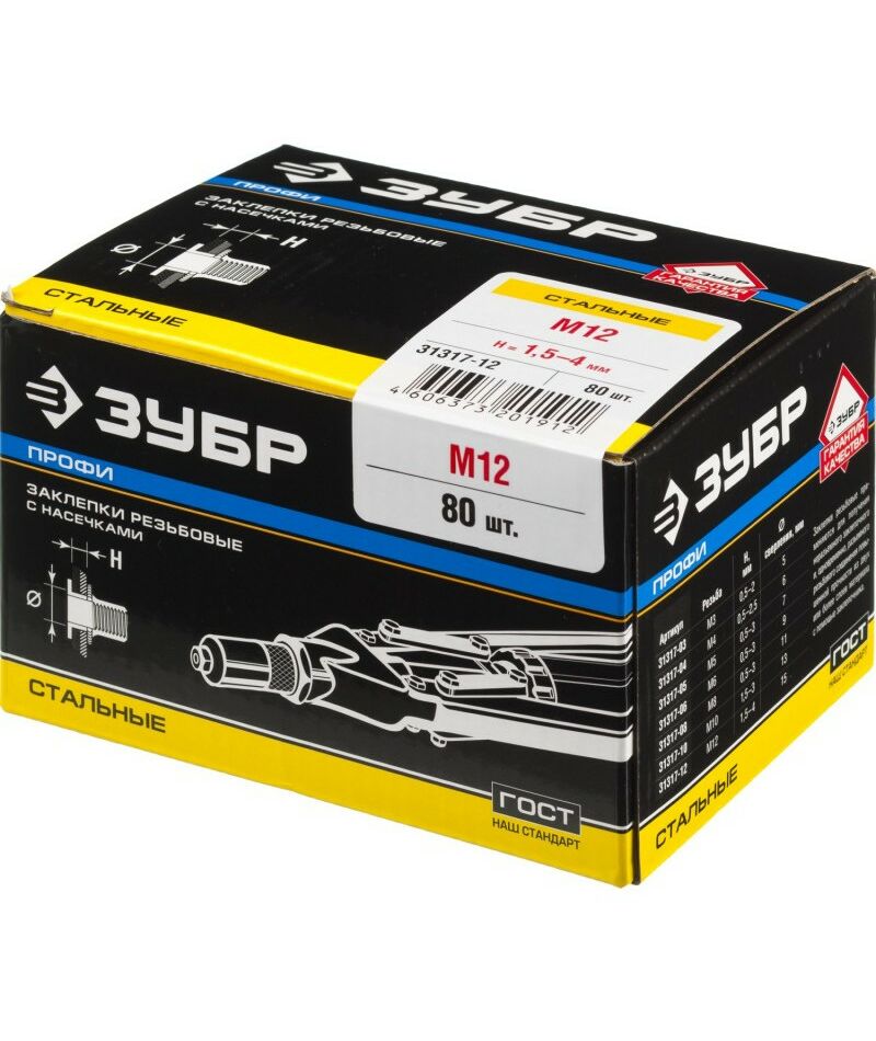 Стальные резьбовые заклепки с насечками Зубр Профессионал М12 станд.бортик, 80 шт [31317-12]