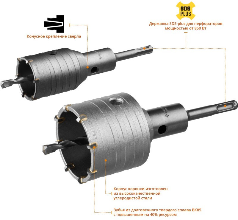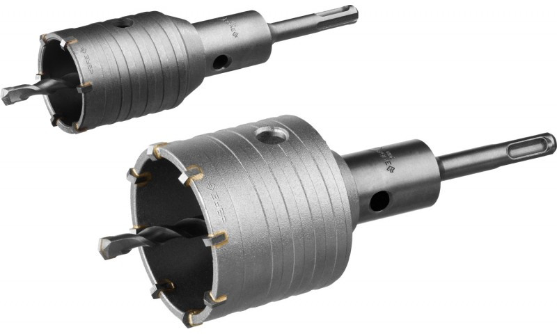 - При прокладке коммуникаций в строящемся здании не обойтись без коронок по бетону. Они позволяют без труда получать отверстия среднего или большого диаметра в самых прочных материалах. Коронки имеют твердосплавные зубья из сплава ВК85, усовершенствованную систему крепления сверла на конус и резьбовое соединение с державкой М22.
