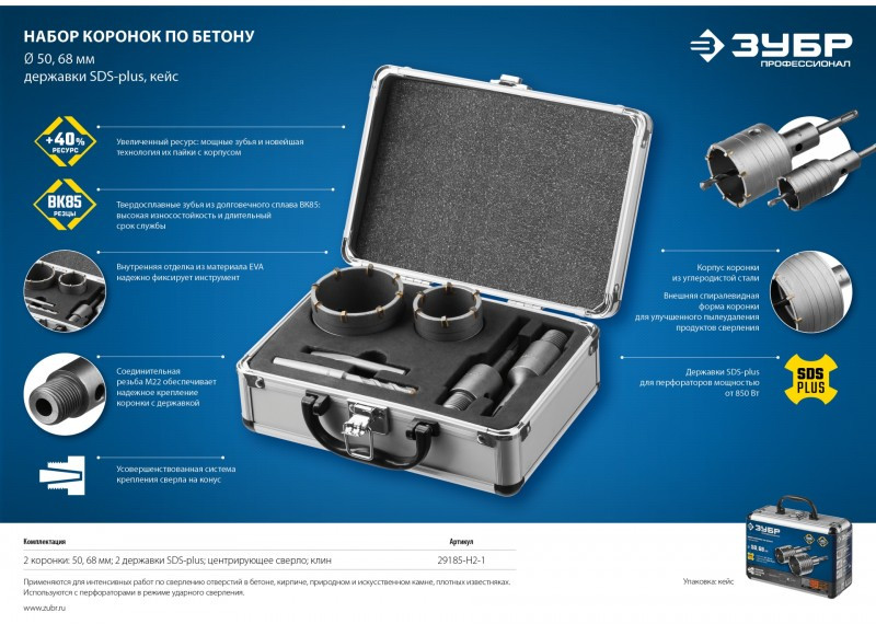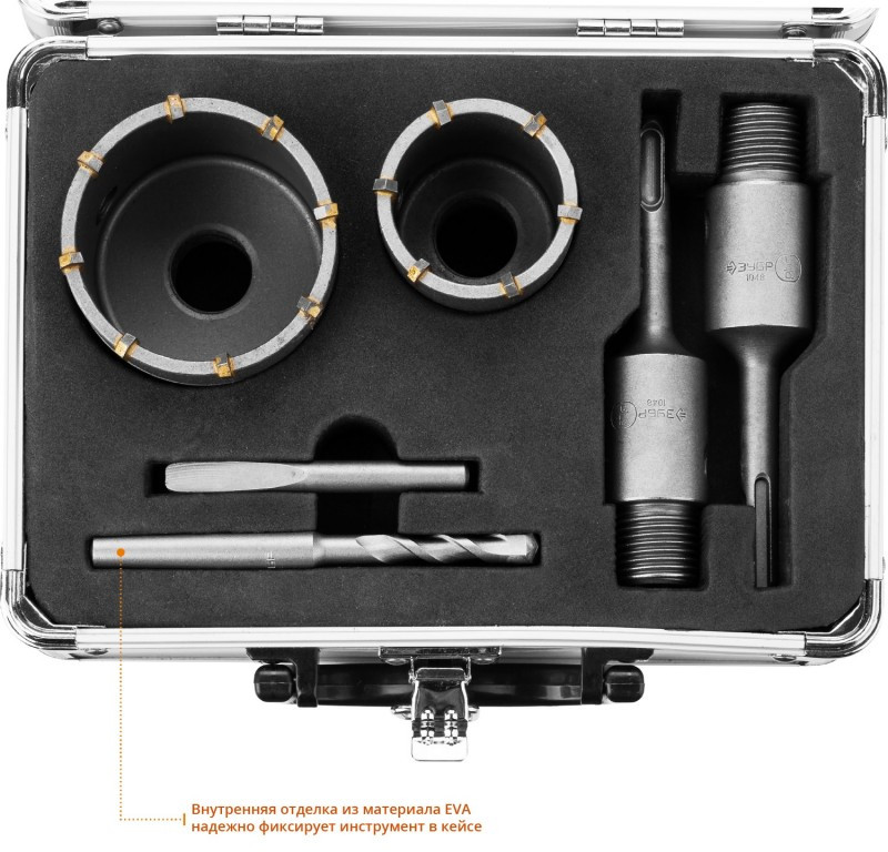 Набор коронок по бетону с оснасткой Зубр Профессионал 29185-H2-1 d = 50, 68 мм, кейс