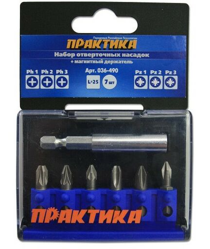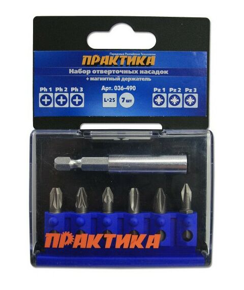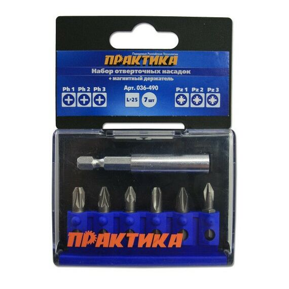 Набор бит Практика 036-490 7шт, ПРОФИ, РН1,2,3, PZ1,2,3х25мм, магнитный держатель