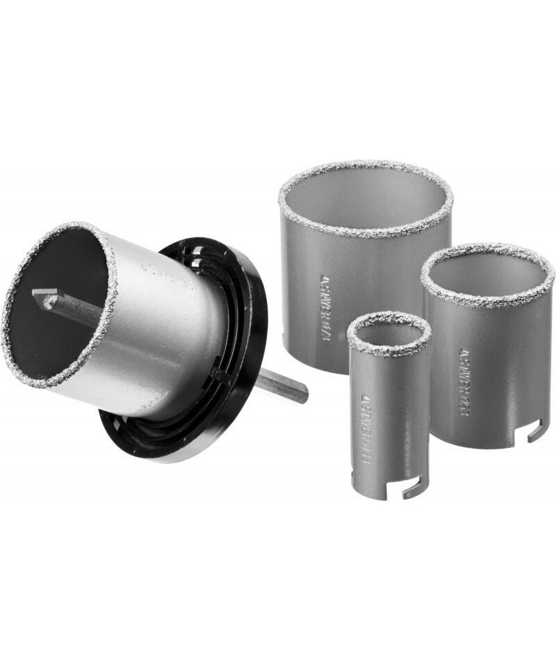 Набор применяется для получения ровных отверстий в облицовочных материалах, а также в ячеистом бетоне, кирпиче и гипсокартоне. Используется на дрелях и легких перфораторах в режиме безударного сверления.
