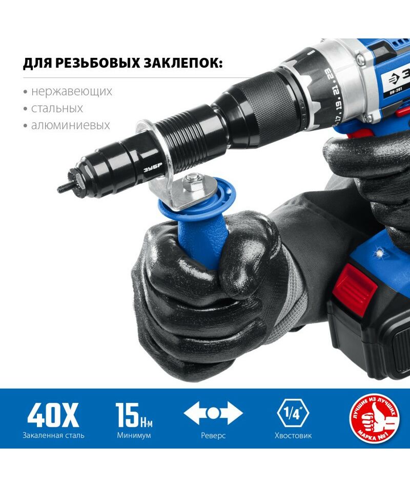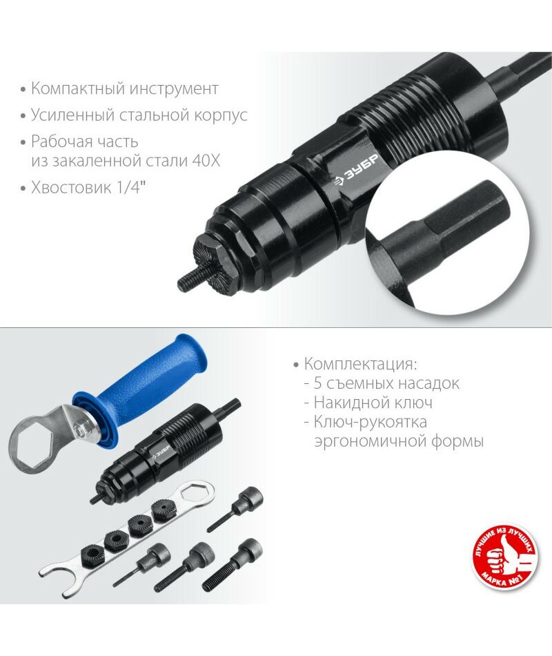 - Насадка-заклепочник ЗУБР - это надежный и компактный инструмент для формирования соединений с помощью заклепок.