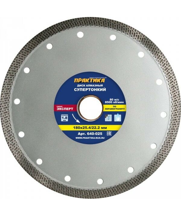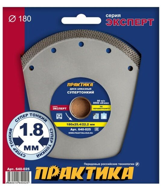 Диск алмазный несегментный Практика 640-025 Супер тонкий, 180 х 25.4/22 мм, толщина 1.8 мм, (1 шт.) коробка