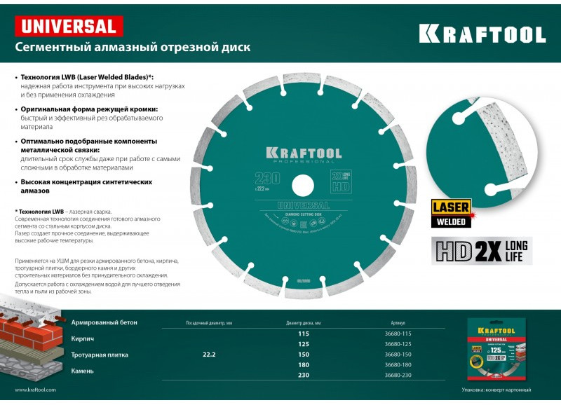 Диск алмазный отрезной сегментный KRAFTOOL UNIVERSAL 150 мм по железобетону, высокопрочному бетону [36680-150]