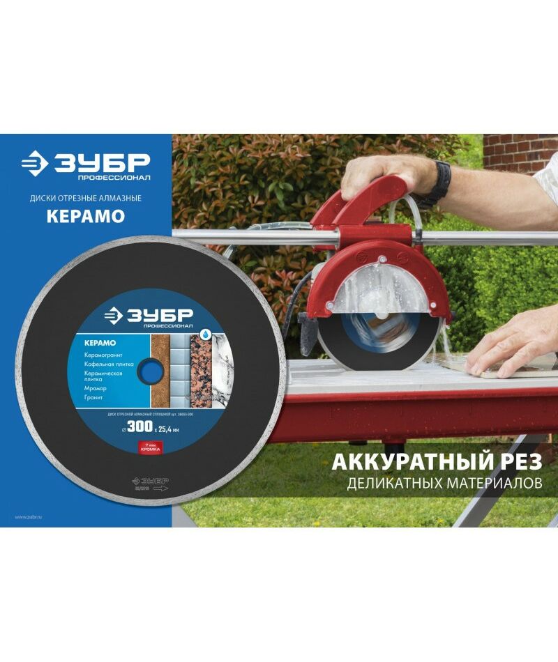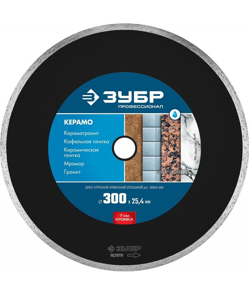 Диск алмазный отрезной Зубр Профессионал КЕРАМО-25 300 мм 25.4 мм, 7 х 3.2 мм, сплошной по керамограниту, мрамору, плитке [36655-300]