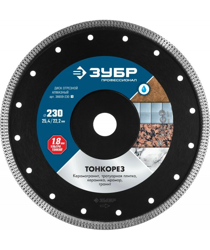 Диск алмазный отрезной Зубр Профессионал ТОНКОРЕЗ 230 мм сплошной ультратонкий [36659-230_z01]