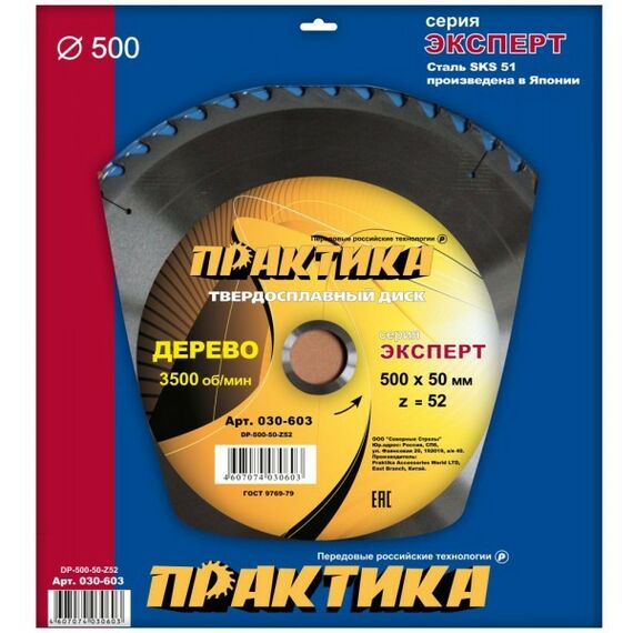 Диск пильный твёрдосплавный Практика 030-603 по дереву, ДСП, 500 х 50 мм, 52 зуба