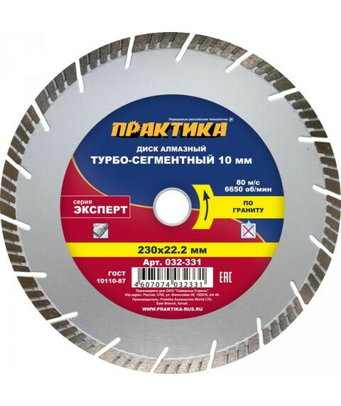 Диск алмазный/гранит Практика 032-331 230х22х3мм, 10мм, серия ЭкспертTURBO, сегментный