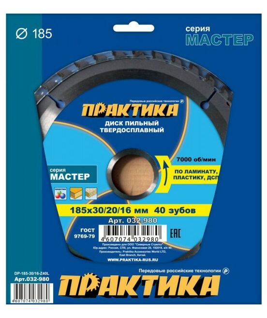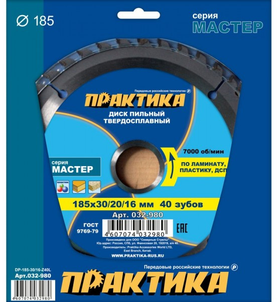 Диск/ламинат Практика 032-980 185х30/20/16мм, Z40