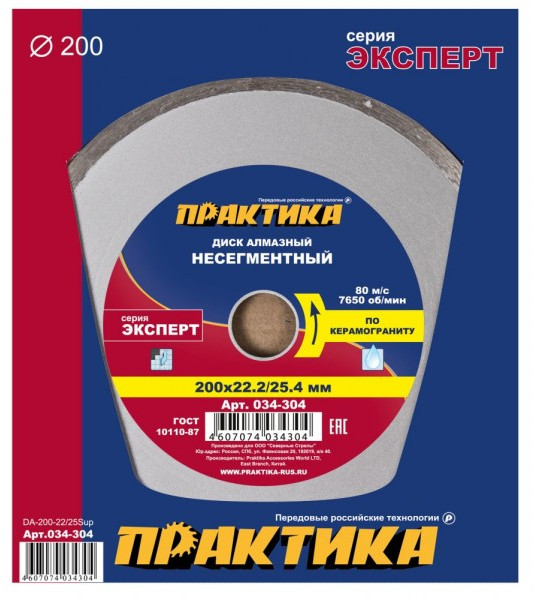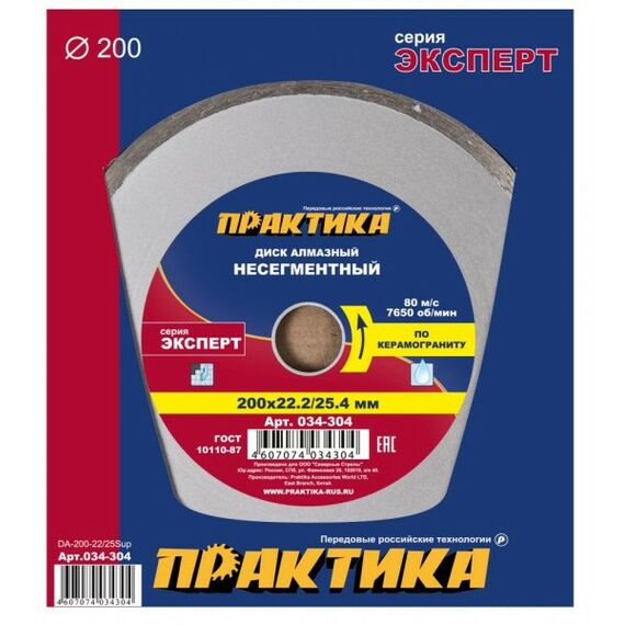 Диск алмазный несегментный Практика 034-304 Эксперт-керамогранит, 200 х 2225.4 мм, (1 шт.) коробка