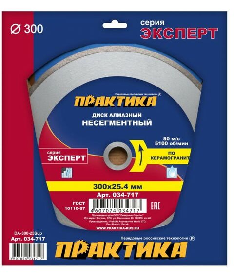 Диск алмазный несегментный Практика 034-717 Эксперт-керамогранит, 300 х 25.4 мм, 1 шт., коробка