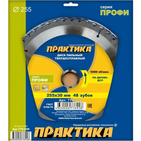 Диск пильный твердосплавный Практика 776-928 по дереву, ДСП, 255*30мм, 48 зубов
