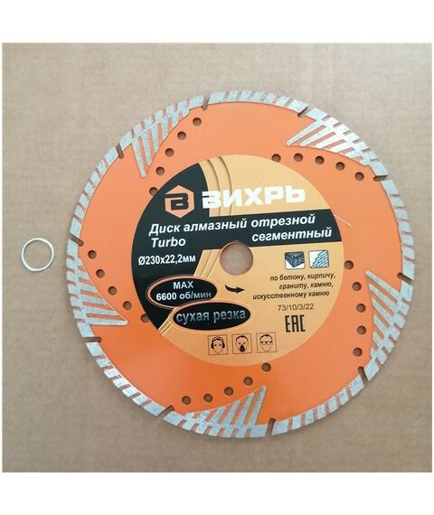 - Диск алмазный отрезной Турбо - сегментный, 230 х 22,2 мм, сухая резка Вихрь - это алмазный отрезной диск, который используется совместно с угловыми шлифмашинами (болгарками) для сухой резки гранитных, бетонных, кирпичных и каменных изделий.