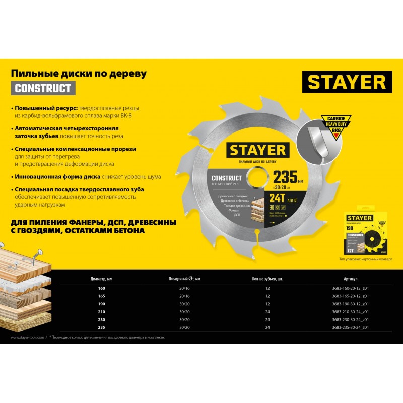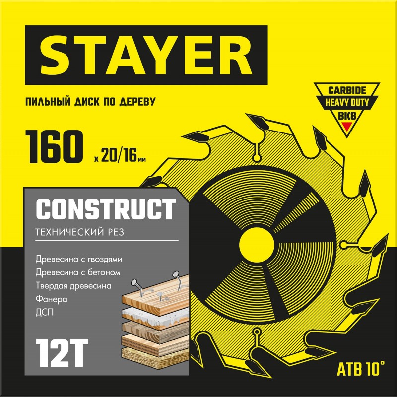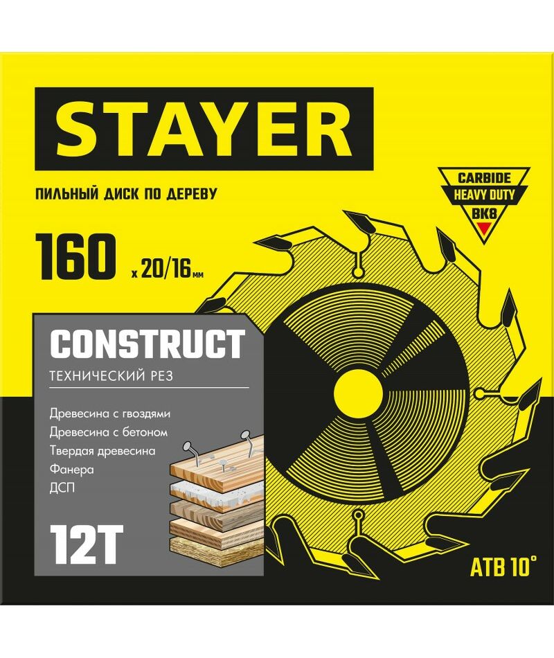 Пильный диск по дереву STAYER Construct, 160 x 20/16 мм, 12Т технический рез [3683-160-20-12_z01]