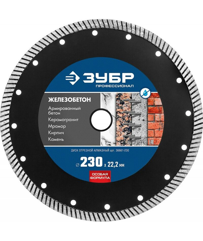 Диск алмазный отрезной сегментированный Зубр Профессионал ЖЕЛЕЗОБЕТОН 230 мм по железобетону, армированному бетону [36661-230]