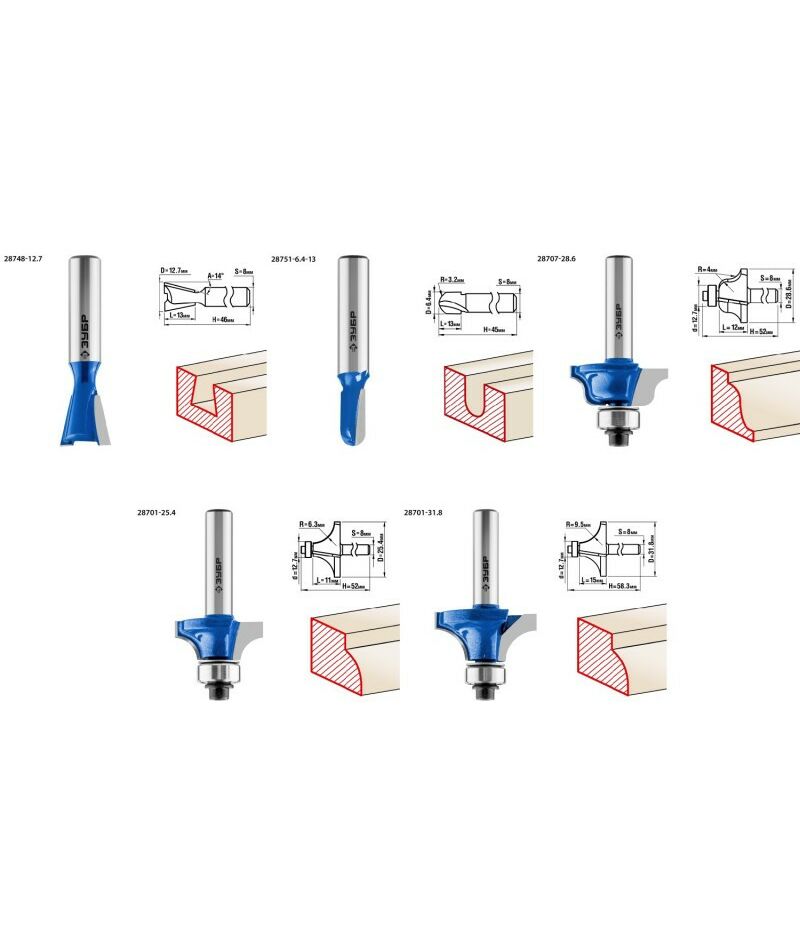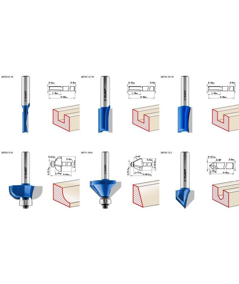 Набор фрез отлично подходит для профилирования кромок, изготовления декоративных пазов и рисунков, фрезерования канавок при работе с различными видами древесины.
