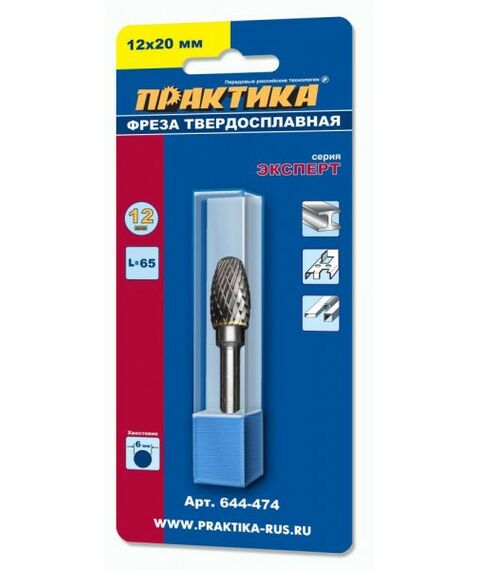 Фреза по металлу твердосплавная Практика 644-474 тип Е овальная, 12*20 мм, хвостовик 6 мм