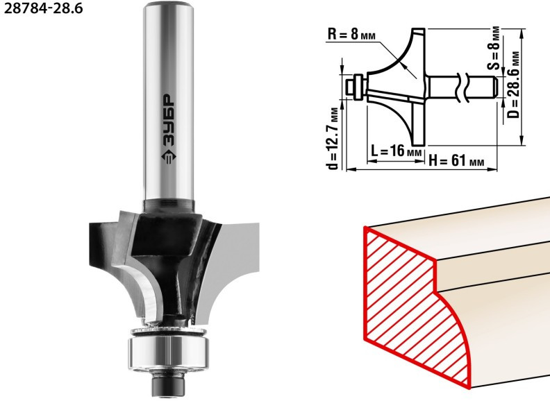 Фреза кромочная калевочная Зубр №1 28.6x16мм радиус 8мм [28784-28.6]