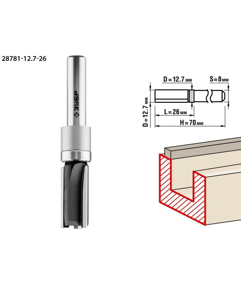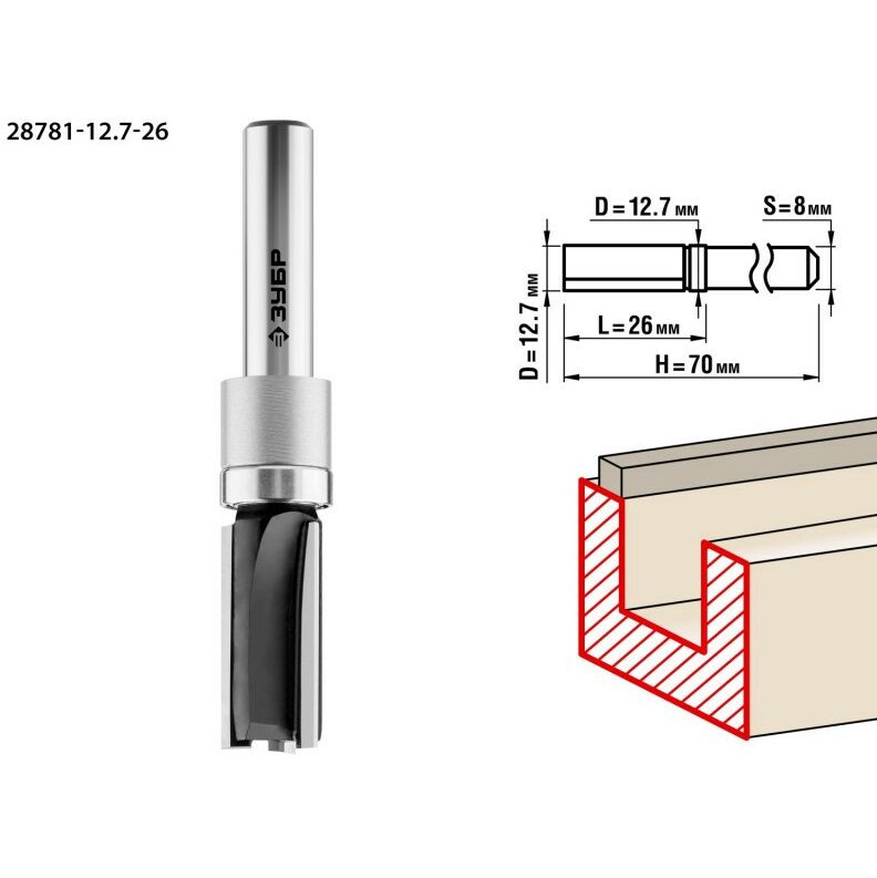 Фреза пазовая прямая с верхним подшипником Зубр 12.7x26мм хвостовик 8мм [28781-12.7-26]