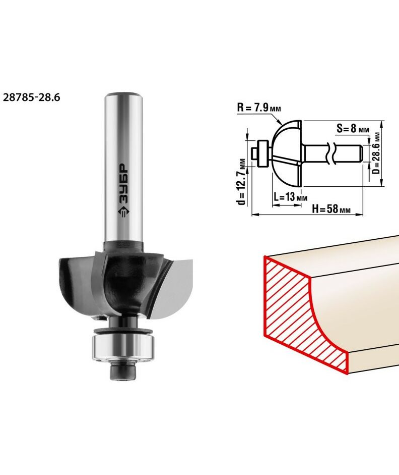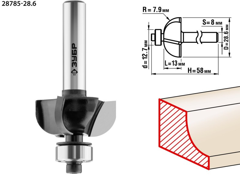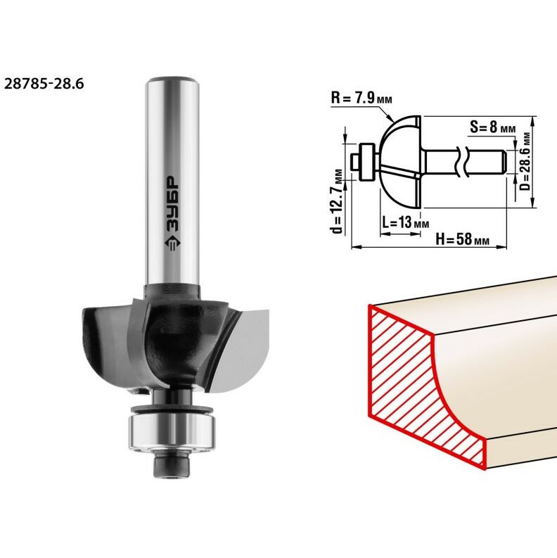 Фреза кромочная калевочная Зубр №2 28.6x13мм радиус 7.9мм [28785-28.6]