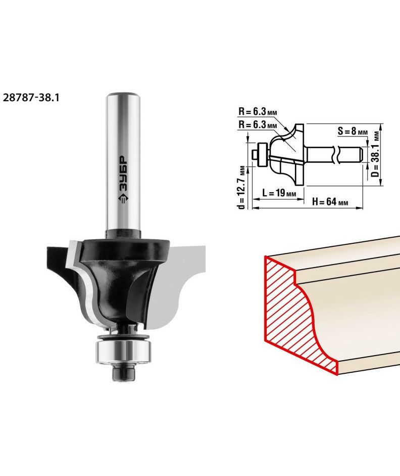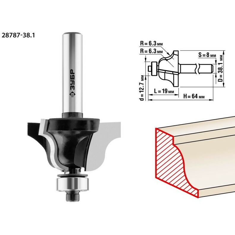 Фреза кромочная калевочная Зубр №4 38.1x19мм радиус 6.3мм [28787-38.1]
