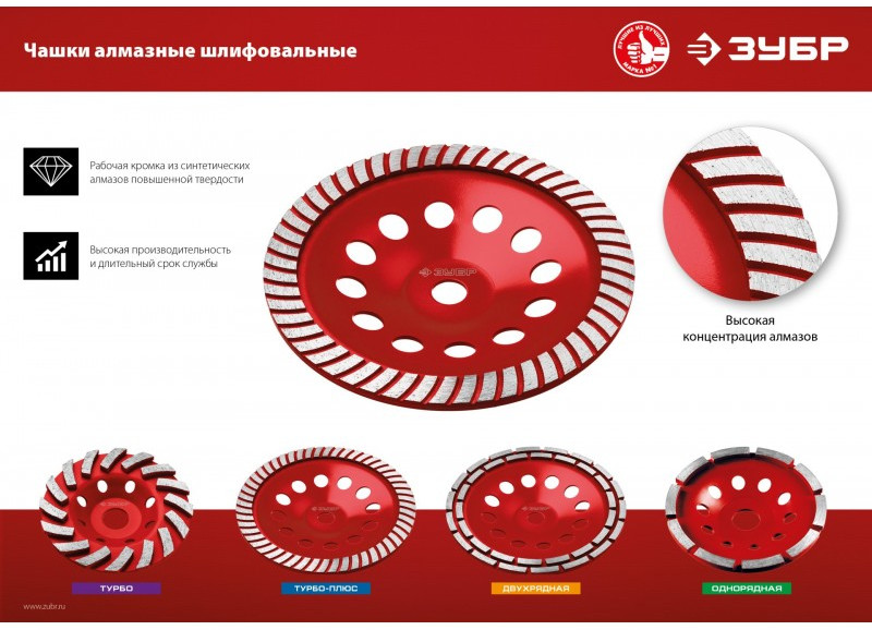 - Высота алмазных сегментов 5 мм обеспечивает продолжительный рабочий ресурс шлифовальной чашки (до 700 квадратных метров площади).
