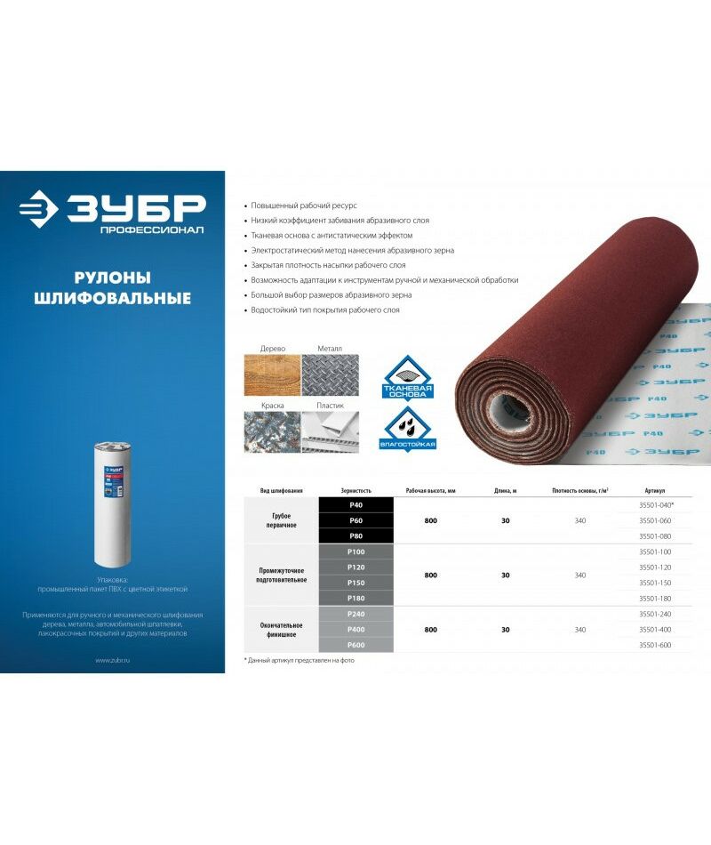 Рулон шлифовальный Зубр Профессионал Р100, 800 мм на тканевой основе, водостойкий, 30 м [35501-100]