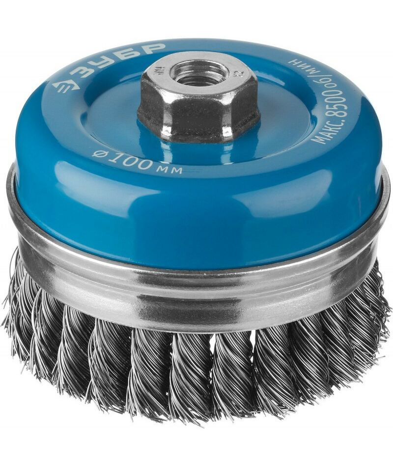 Щетка чашечная усиленная для УШМ Зубр Профессионал 100ммхМ14 плетеные пучки стальной проволоки 0.5мм [3527-100]