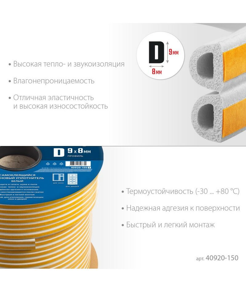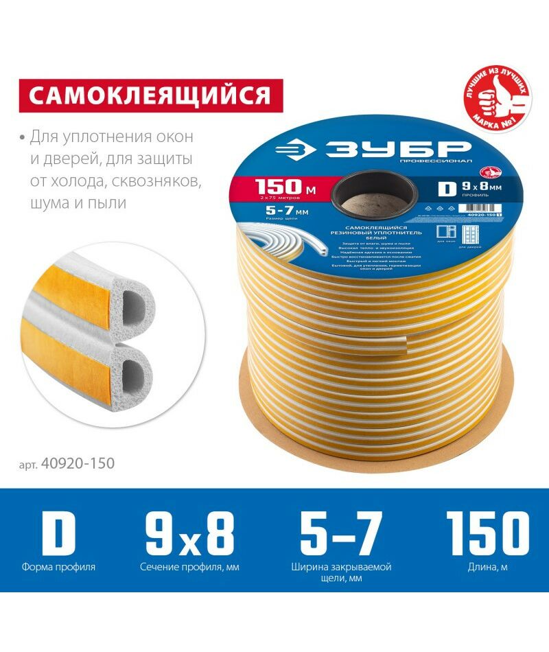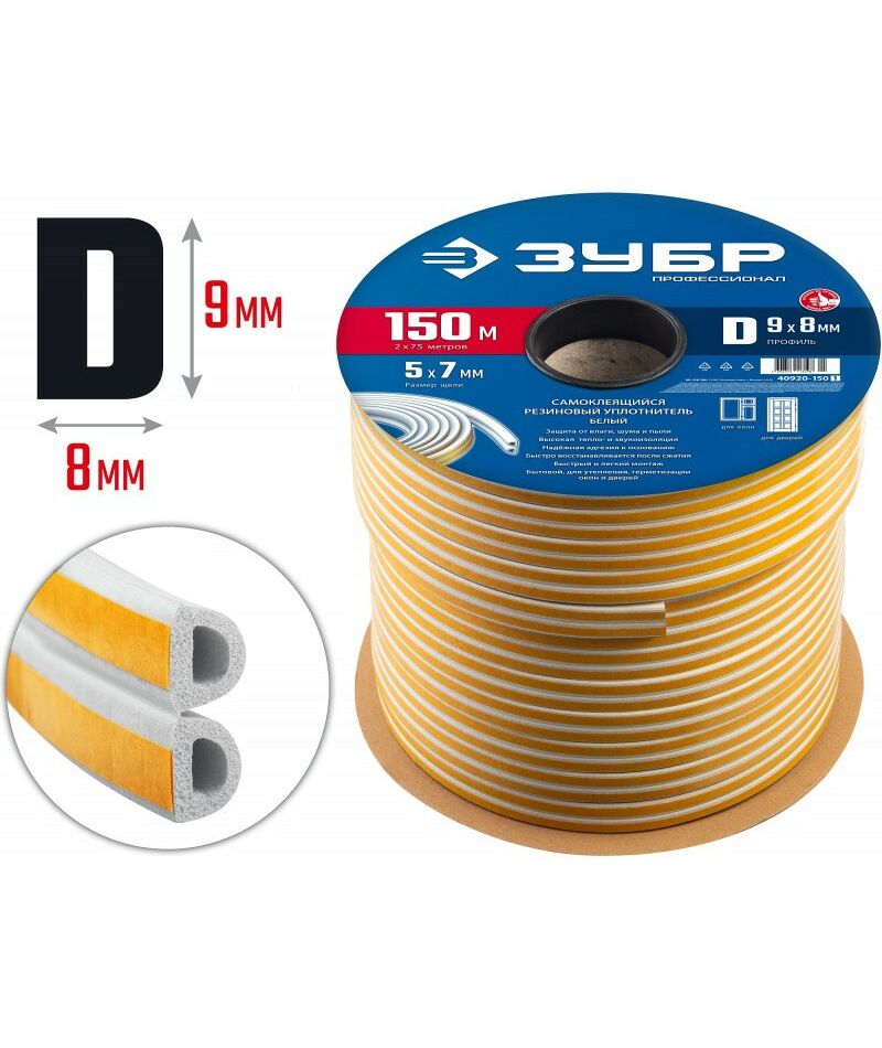 Самоклеящийся резиновый уплотнитель Зубр Профессионал 150 м D-профиль размер 9 х 8 мм, белый [40920-150]