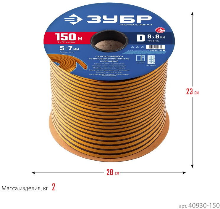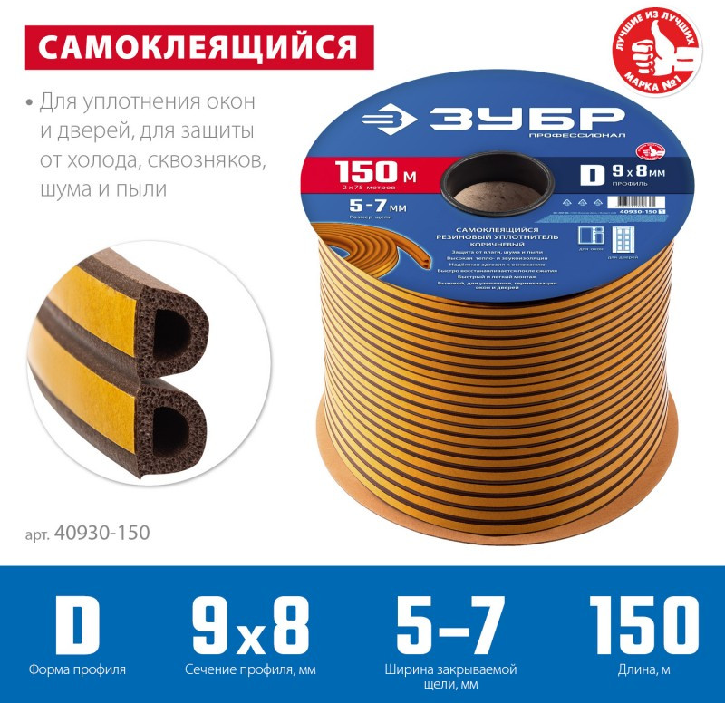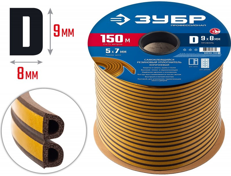 Самоклеящийся резиновый уплотнитель Зубр Профессионал 150 м D-профиль размер 9 х 8 мм, коричневый [40930-150]