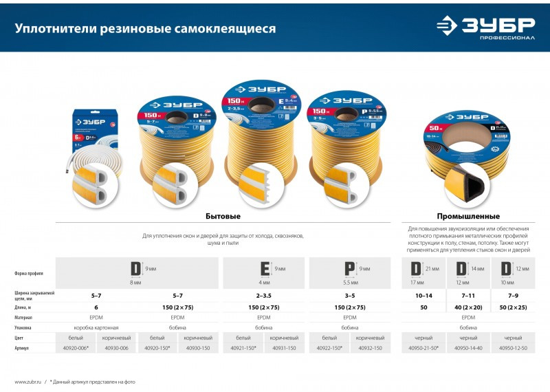 Уплотнитель ЗУБР предназначен для уплотнения окон и дверей. Помогает сохранить в доме тепло зимой и прохладу летом, оберегает от холода, сквозняков, шума и пыли.