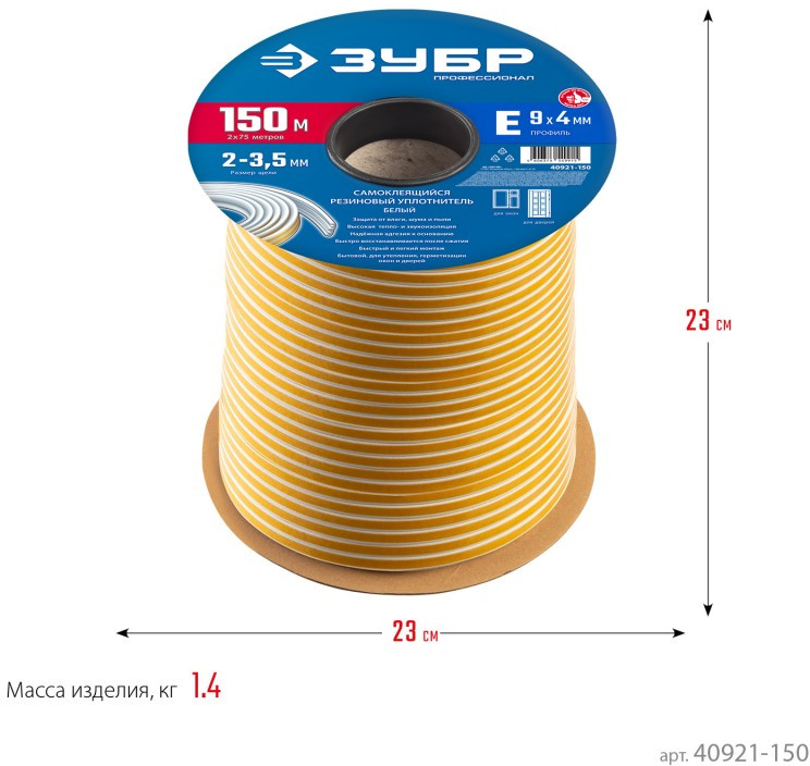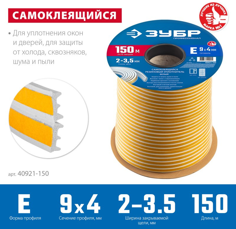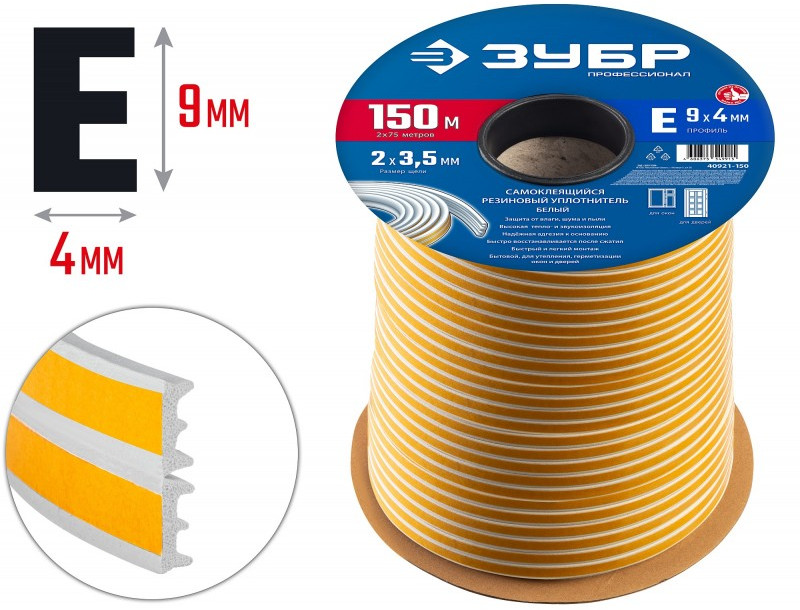 Самоклеящийся резиновый уплотнитель Зубр Профессионал 150 м E-профиль размер 9 х 4 мм, белый [40921-150]