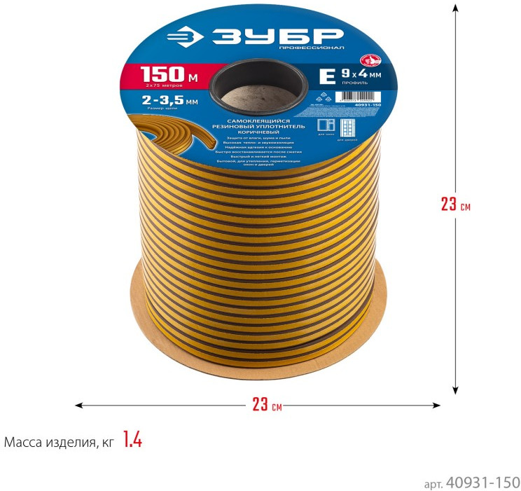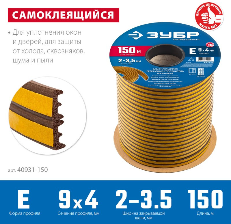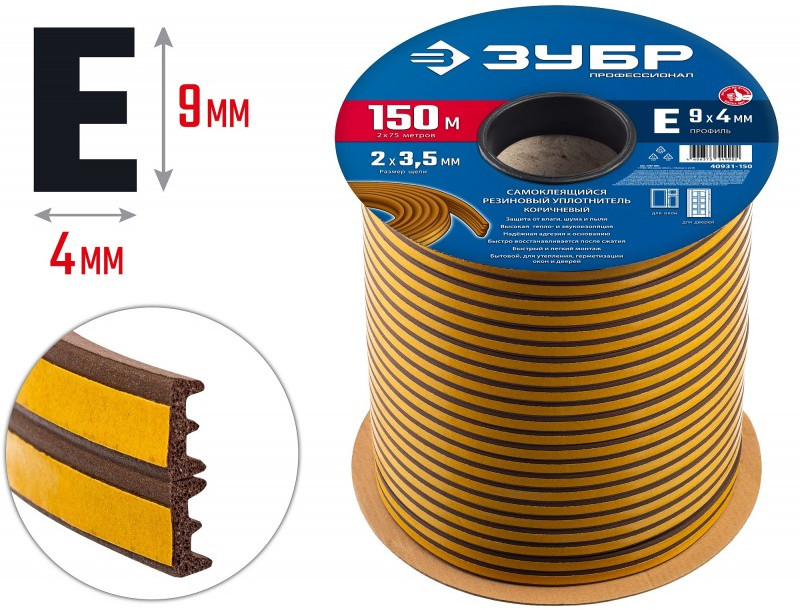 Самоклеящийся резиновый уплотнитель Зубр Профессионал 150 м E-профиль размер 9 х 4 мм, коричневый [40931-150]