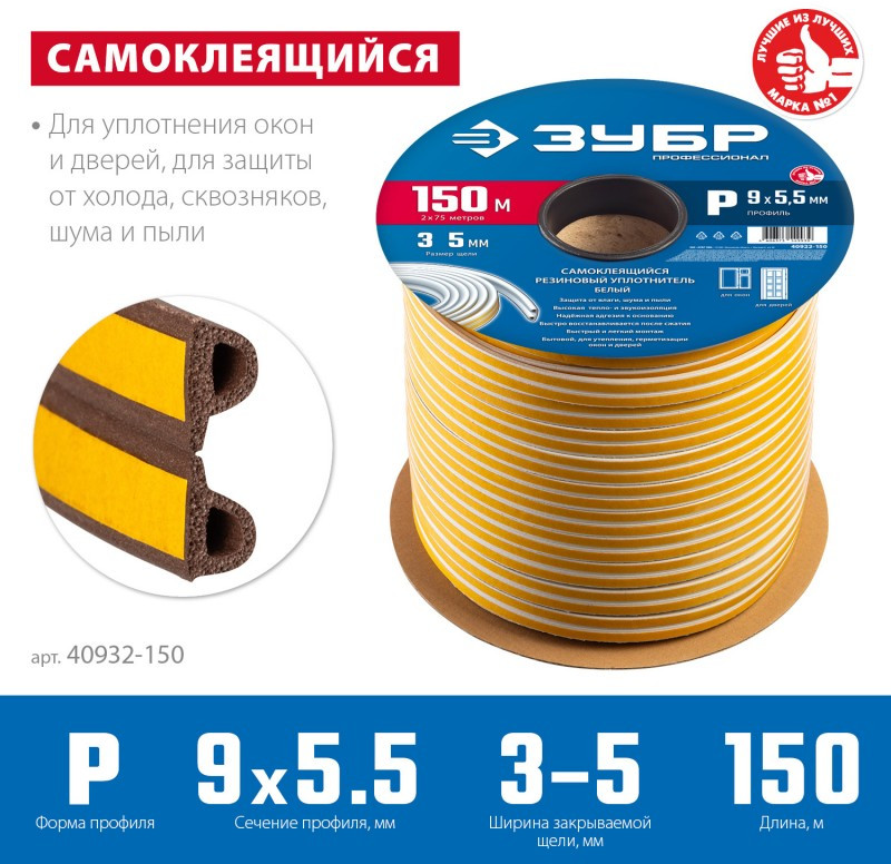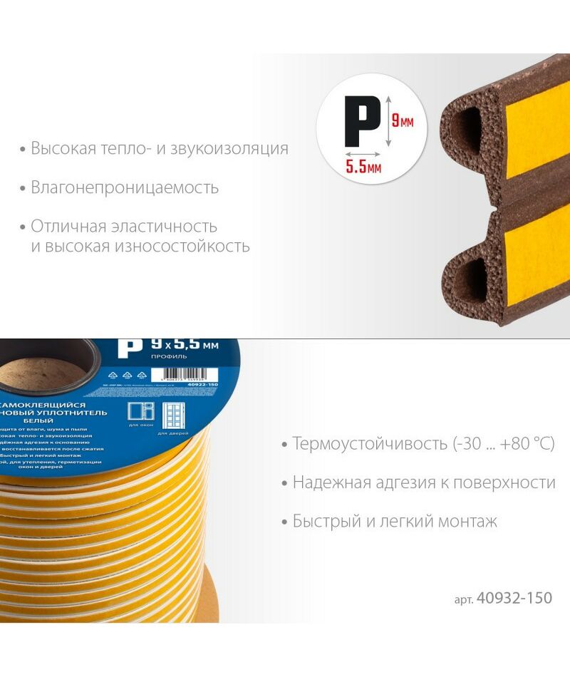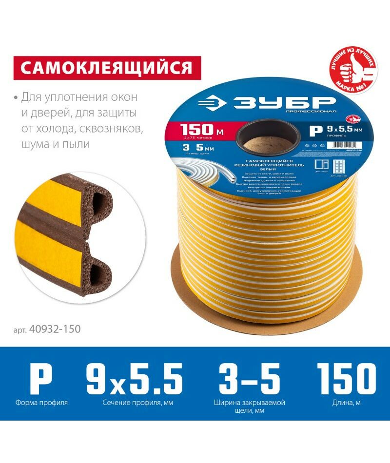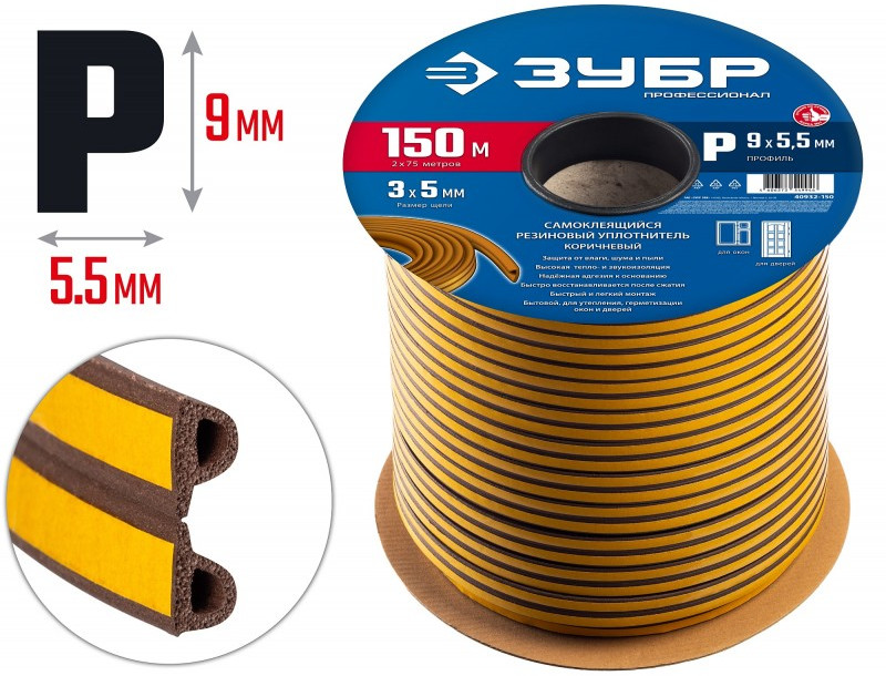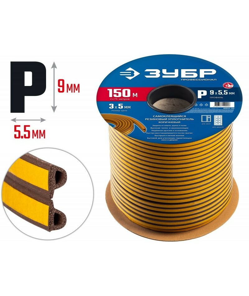 Самоклеящийся резиновый уплотнитель Зубр Профессионал 150 м P-профиль размер 9 х 5.5 мм, коричневый [40932-150]