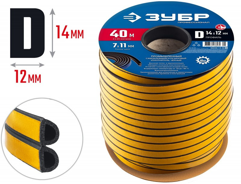 Самоклеящийся промышленный резиновый уплотнитель Зубр Профессионал 40 м D-профиль размер 14 х 12 мм, черный [40950-14-40]