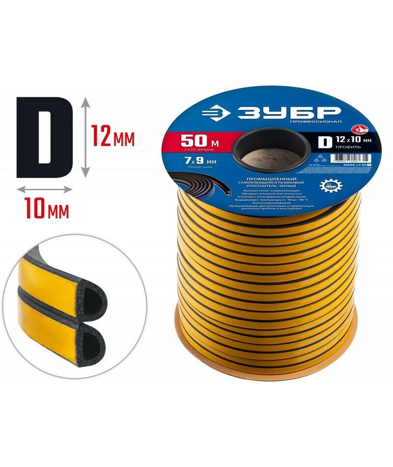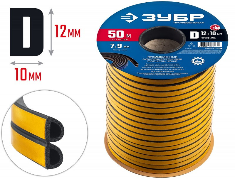 Самоклеящийся промышленный резиновый уплотнитель Зубр Профессионал 50 м D-профиль размер 12 х 10 мм, черный [40950-12-50]