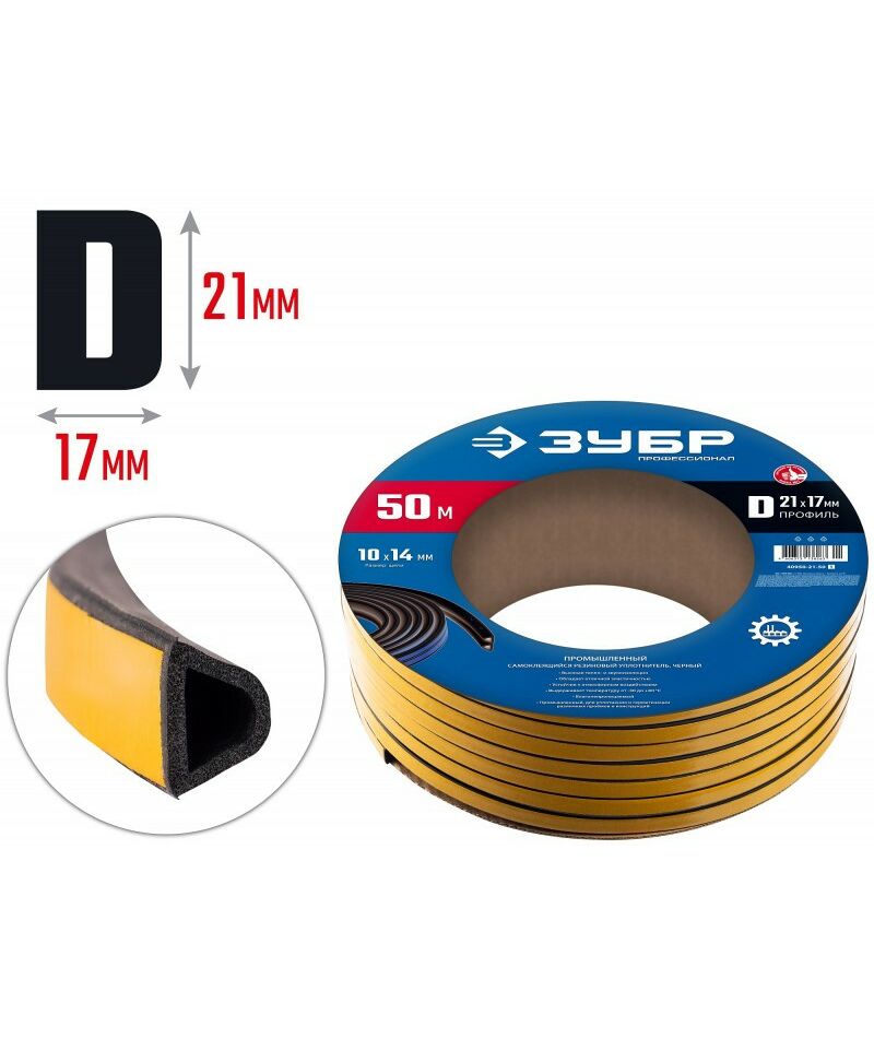 самоклеящийся промышленный резиновый уплотнитель Зубр Профессионал 50 м D-профиль размер 21 х 17 мм, черный [40950-21-50]