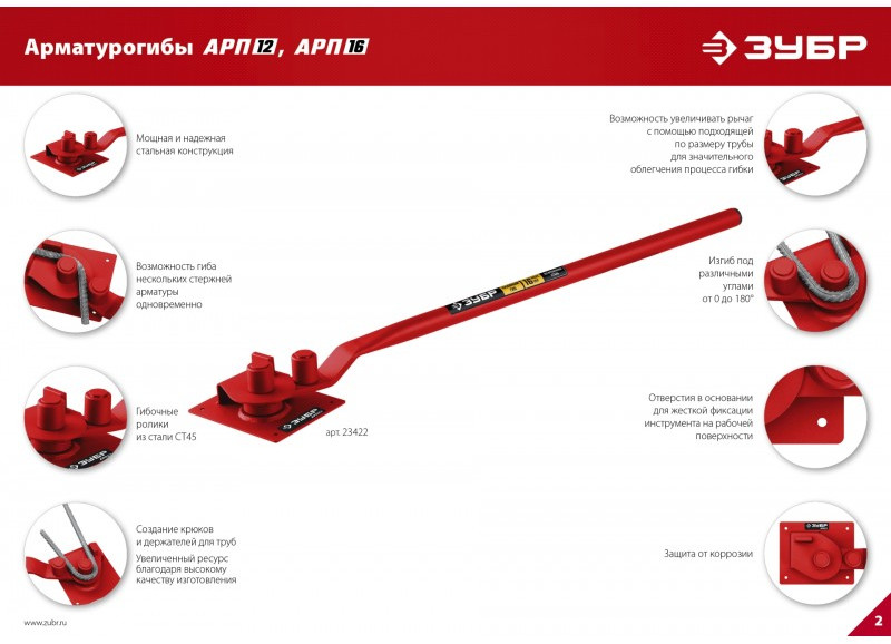 Профессиональный Арматурогиб ЗУБР для плавного гиба гладкой и рельефной арматуры Закалёная сталь Усиленная конструкция Создание крюков и держателей для труб Возможность увеличивать рычаг для облегчения процесса гибки Отверстия для надёжной фиксации Увеличенный ресурс