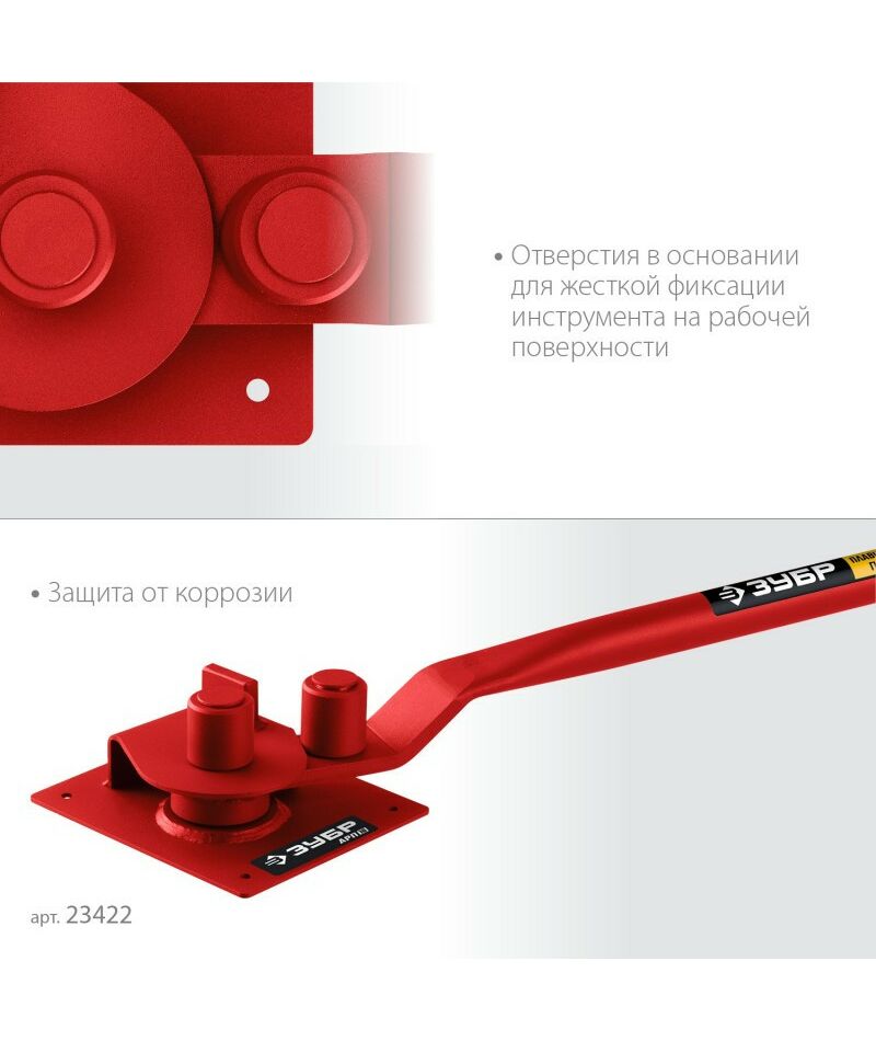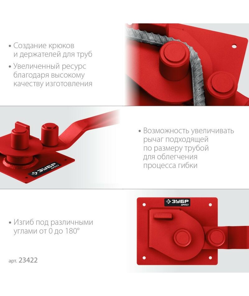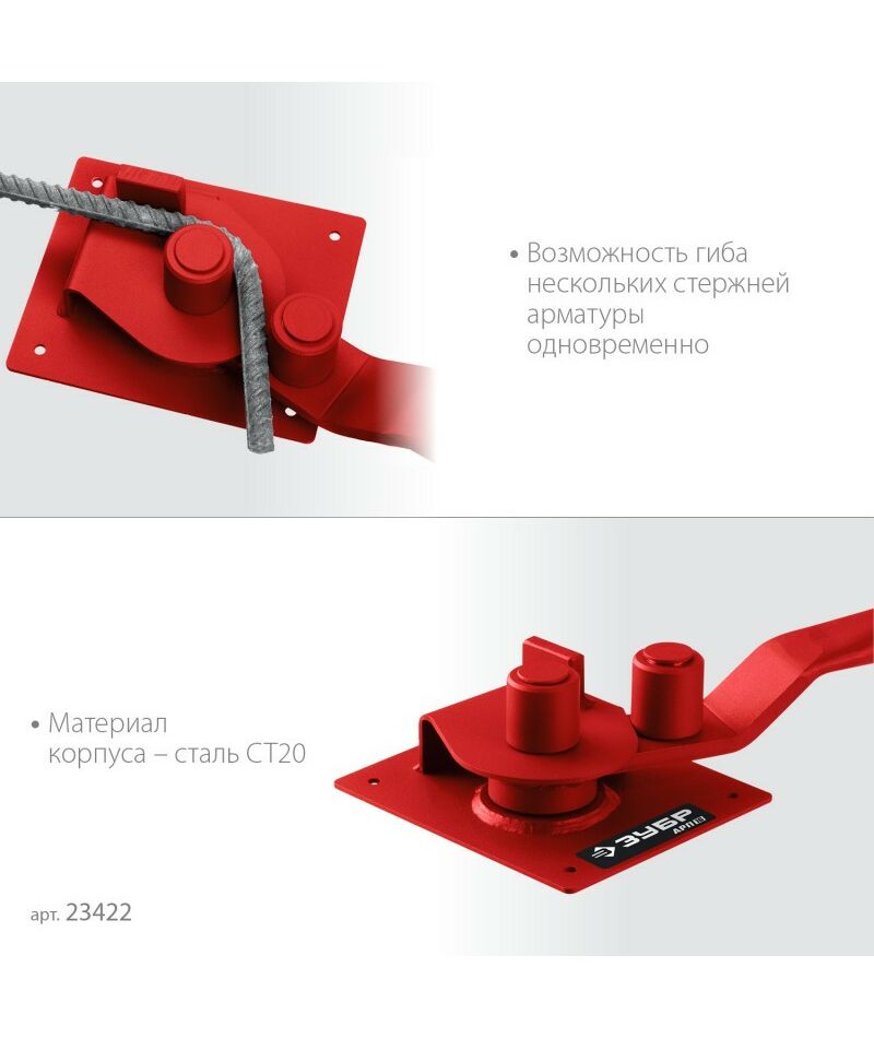 Профессиональный Арматурогиб ЗУБР для плавного гиба гладкой и рельефной арматуры Закалёная сталь Усиленная конструкция Создание крюков и держателей для труб Возможность увеличивать рычаг для облегчения процесса гибки Отверстия для надёжной фиксации Увеличенный ресурс