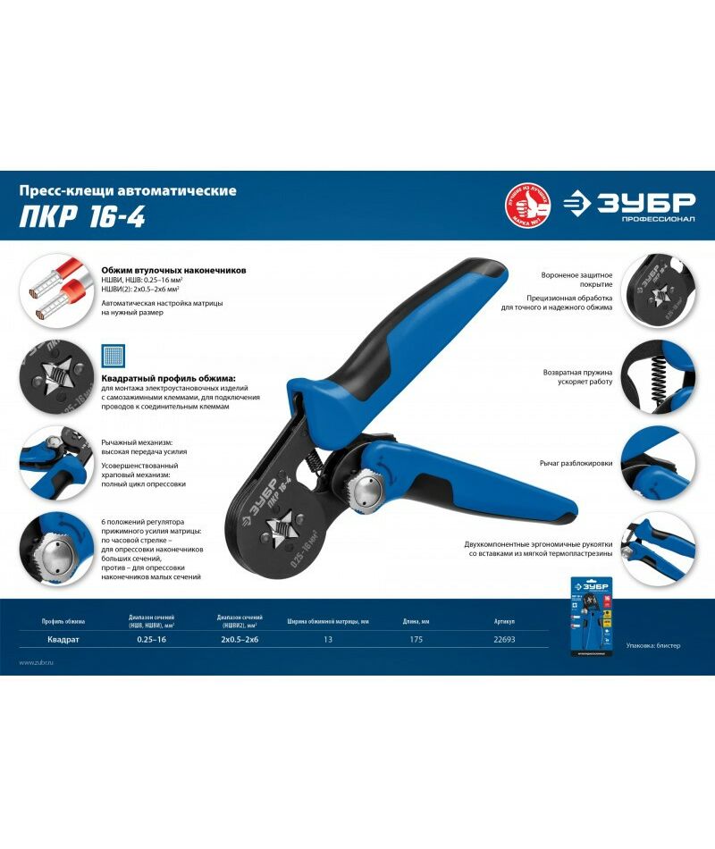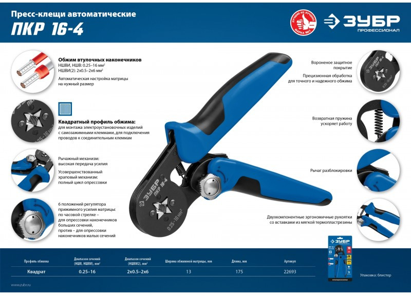 Пресс-клещи для втулочных наконечников Зубр Профессионал ПКР-16-4 0.25 - 16 мм.кв [22693]