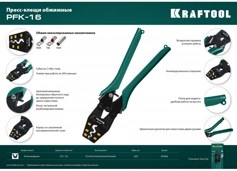 - Пресс-клещи KRAFTOOL изготовлены из высококачественной стали с закалкой рабочих поверхностей, предназначен для профессионального применения. Обладает повышенным ресурсом, обеспечивает наивысшее качество электромонтажных работ.