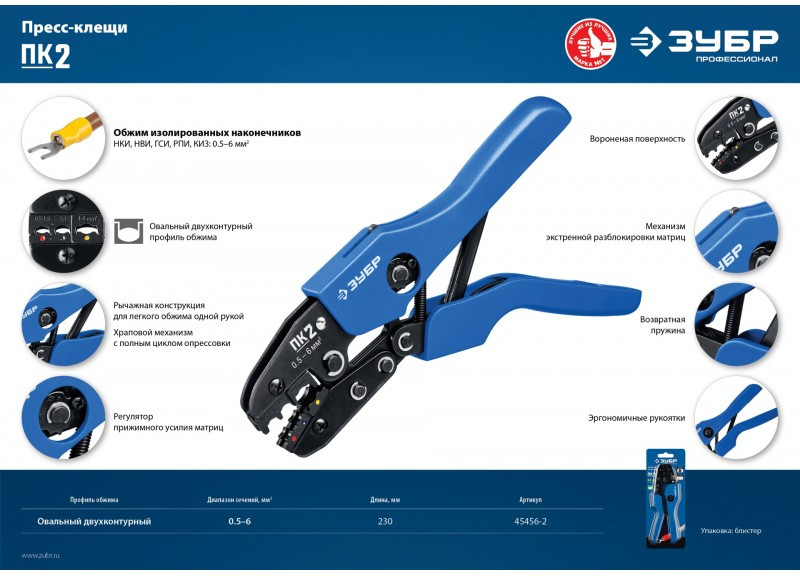 Пресс-клещи Зубр Профессионал ПК-2 для изолированных наконечников и муфт 0.5 -6 мм.кв [45456-2]