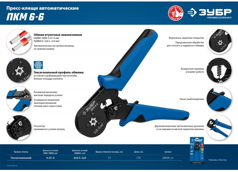 Пресс-клещи Зубр Профессионал ПКМ-6-6 для втулочных наконечников 0.25 - 6 мм.кв [22654_z01]